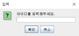Swing 패키지의 JOptionPane.showInputDialog () 를 사용하여 입력을 받아보겠다. import javax.swing.JOptionPane; 상단에 위와 같은 코드를 입력해준다. 만약에 여기서 빨간줄이 뜬다면 패키지를 생성할 때 Create module-info.java file 이라는 부분의 체크를 해제해준다. 나도 에러가 떠서 패키지를 다시 만들었다. package study; import javax.swing.JOptionPane; public class test { public static void main(String args[]) { String id = JOptionPane.showInputDialog("아이디를 입력해주세요"); System.out.println(id..